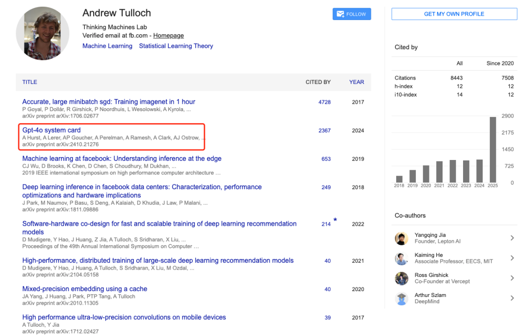 2023 年,Tulloch 加入了 OpenAI,深度参与了 GPT-4o、GPT-4.5 的预训练、推理系统迷惑。据 Google Scholar 页面高慢,他的论文总援用次数为 8443,还与好多东谈主熟知的 Lepton AI 首创东谈主贾扬青、AI 大神何恺明妥洽发表过多篇论文。