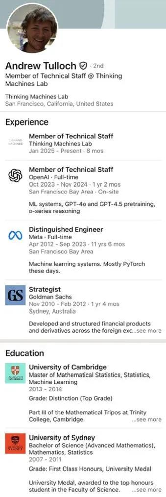 2024 年 2 月,Tulloch 遴荐了从 OpenAI 下野,与 OpenAI 前 CTO Mira Murati 出来创业,共同建筑东谈主工智能初创公司——Thinking Machines Lab,而我方担任联接首创东谈主。